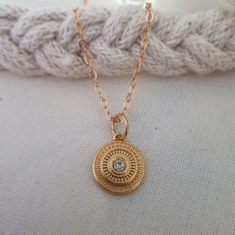 Colar com corrente elo português, 50 cm de comprimento, com pingente maravilhoso, super elegante, redondo com zirconia no centro, todo trabalhado. Possui a frase no verso: "A vida é da cor que a gente pinta". O pingente mede aproximadamente 1,5 cm de diâmetro. Semijoia banhada no dourado.