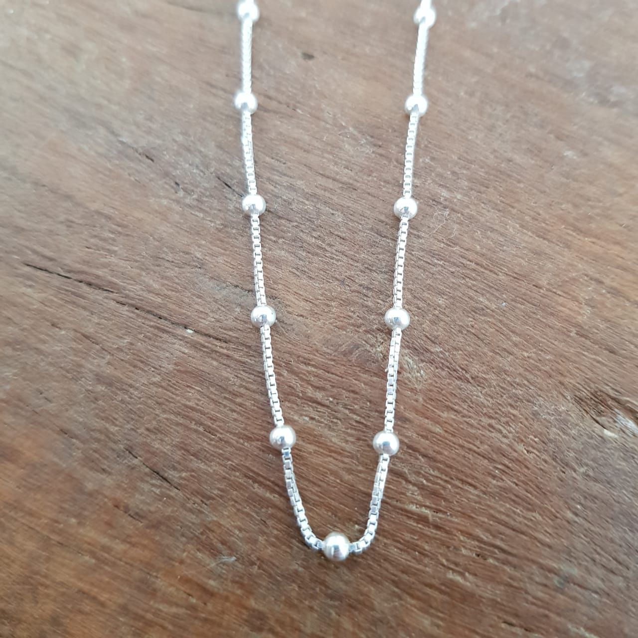 Corrente veneziana com bolinhas, prata 925, medindo 38 cm de comprimento mais 6 cm de extensão.