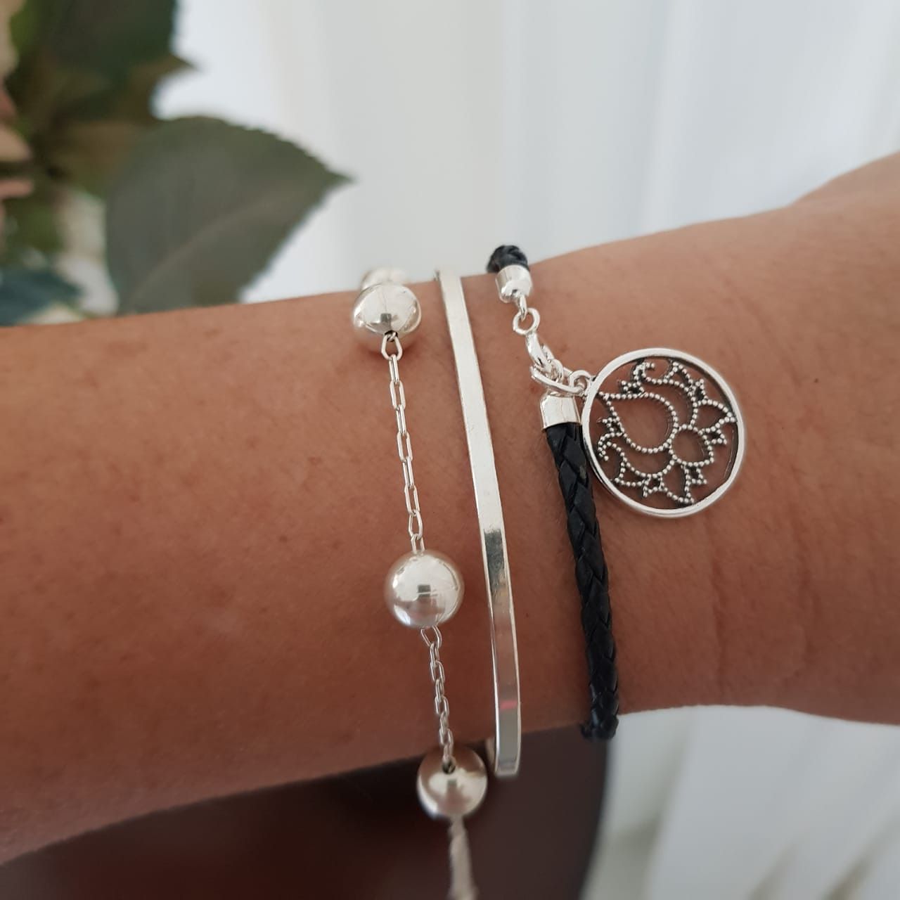 Uma pulseira de bolas com 17,5 cm de comprimento mais 3 cm de extensão.