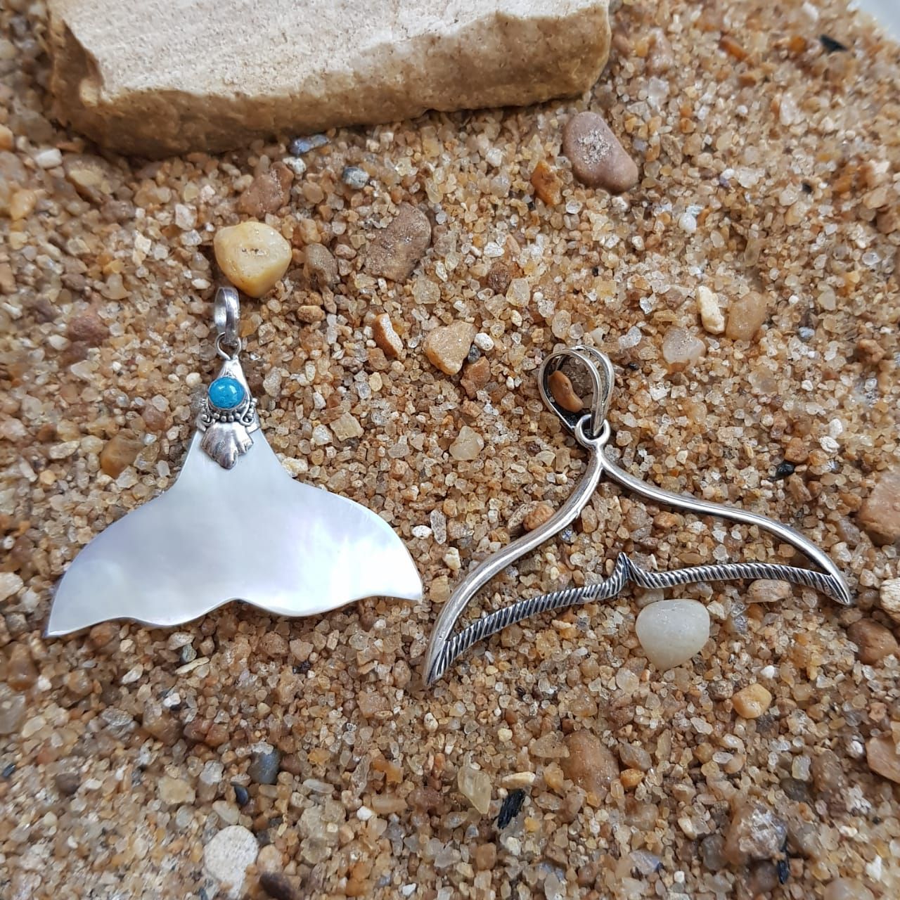 Pingente com o aro vazado medindo aproximadamente 4,5 cm de largura e 2,5 cm de altura e pingente com madrepérola natural e turquesa, medindo 3,5 cm de largura por 3 cm de altura aproximadamente.