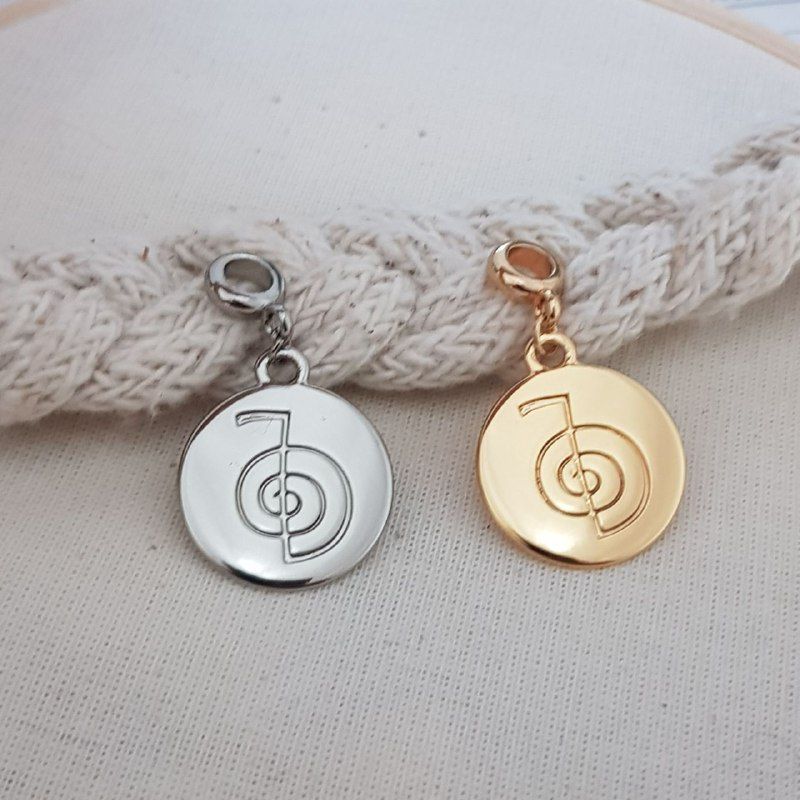 Lindo pingente redondo, banhado, medindo 2 cm de diâmetro com o símbolo de cura do Reiki, Cho Ku Rei. No verso da medalha tem a frase: "Toda energia de cura é uma energia de amor". Opções do banho dourado ou prateado.